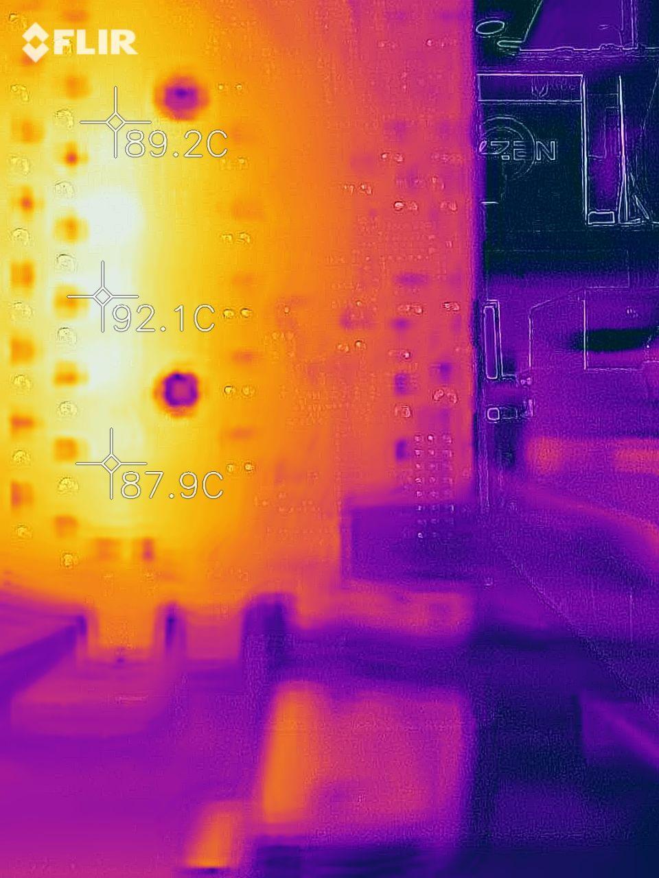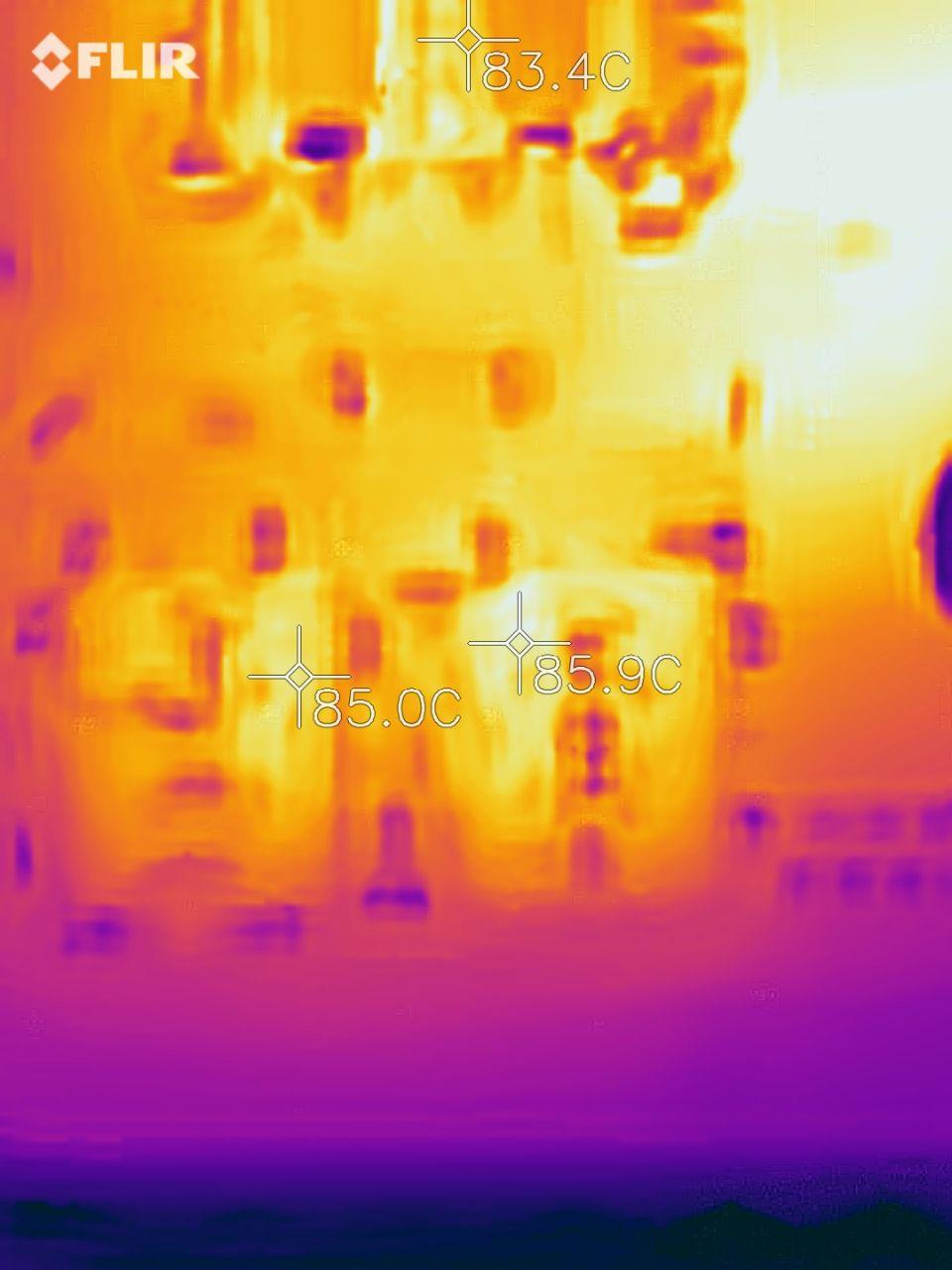 Primeiramente completamente stock e por essas imagens, é possível ver que as memórias da parte inferior (próximas ao PCI-E) ficaram na casa dos 85ºC, enquanto que as localizadas na lateral ficaram na casa dos 77ºC e do topo em 83ºC, valores um pouco altos porém dentro da tolerância para esses chips de memória (95ºC), enquanto que o VRM apresentou máxima de 92.1ºC, o que é algo um pouco alto, entretanto, dentro das expectativas para os valores teóricos apresentados e que apesar dos pesares, não deve representar problemas imediatos.