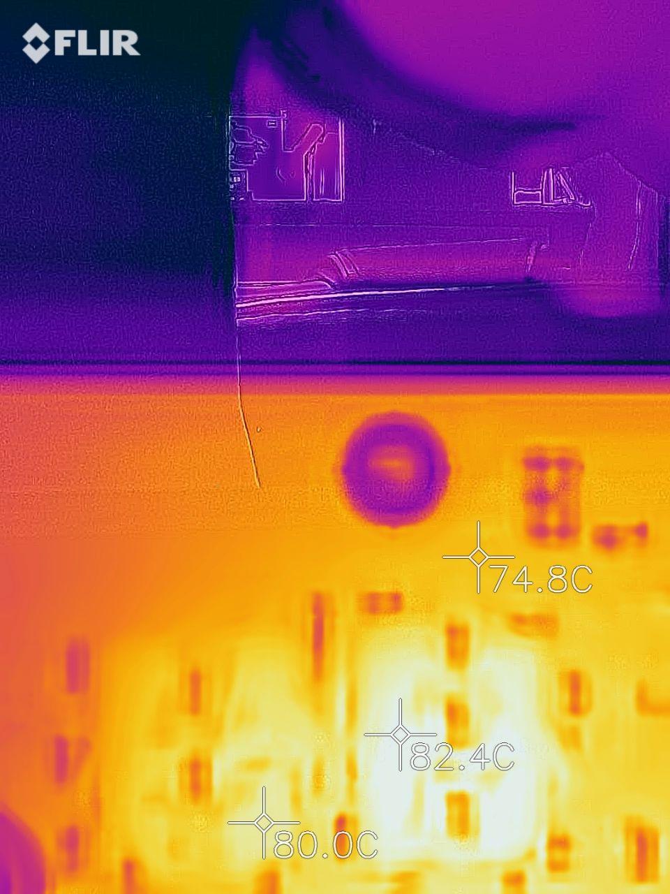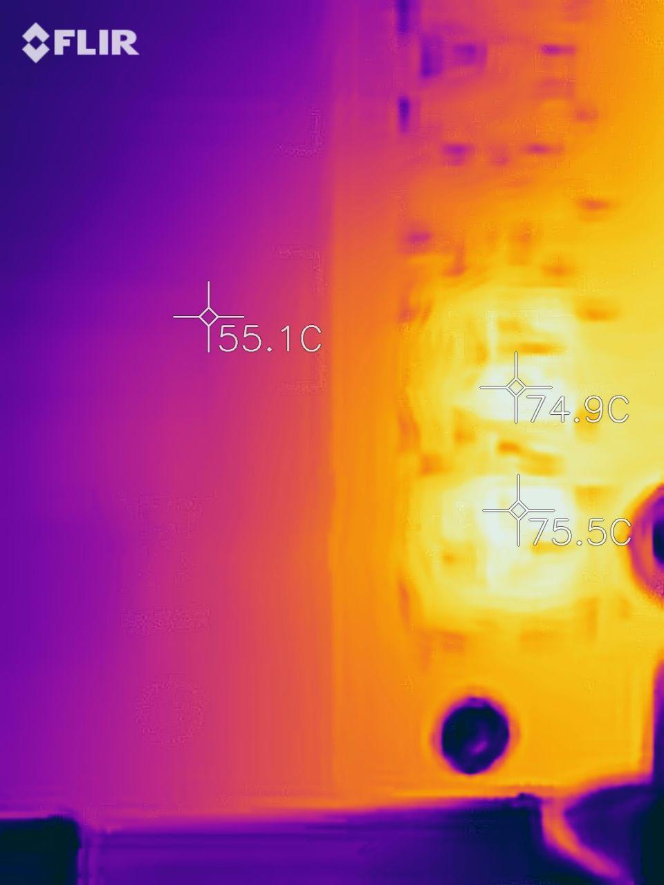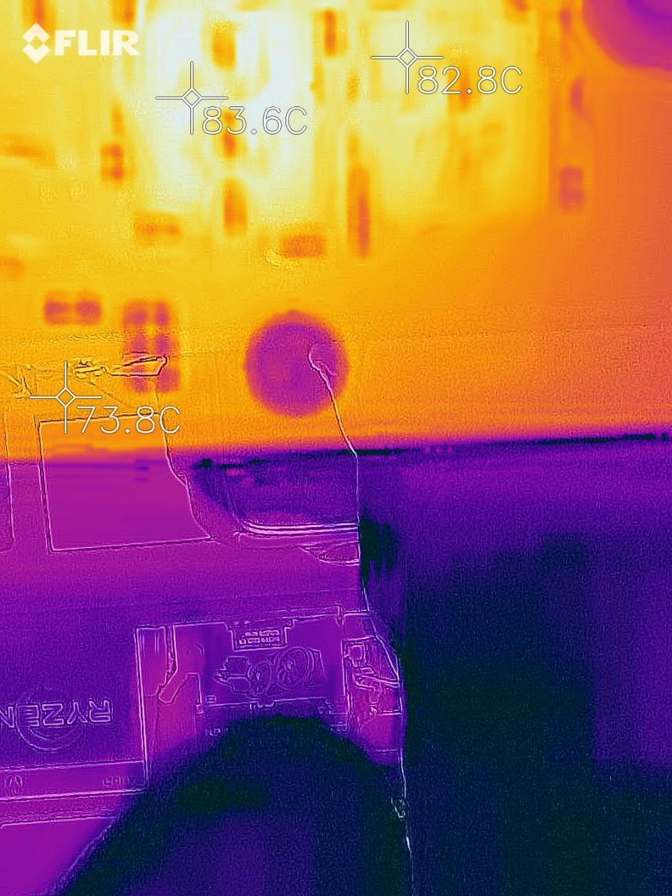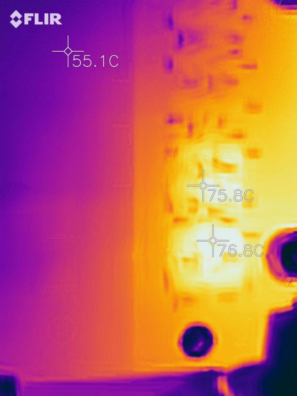 Agora para as temperaturas das memórias/VRM usei a FLIR One LT e para isso tive que desmontar a VGA para remover o backplate devido ao fato do mesmo ser apenas um adereço estético que não faz contato com o PCB, então, diferente dos demais resultados mostrados aqui que foram obtidos com a placa ainda “lacrada”, essas termografias foram feitas após a placa ter sida desmontada. Em ambos os casos, utilizei a bios “TURBO” para registrar essas imagens, tendo sido elas capturadas no ultimo loop do Unigine Superposition e a temperatura ambiente no dia desses testes foi de 33.8ºC.