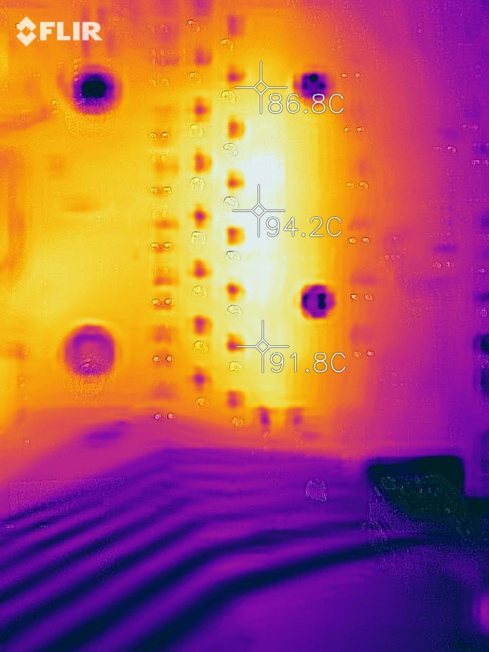 Já com o ajuste em overclock, Fan 100% e PT @ 115%, foram observadas temperaturas na casa dos 83.5ºC nas memórias localizadas na parte inferior do PCB (próximas ao PCI-E), enquanto que as localizadas na lateral ficaram na casa dos 75.5ºC e do topo em 82.4ºC, valores um pouco melhores que em stock devido ao fluxo de ar bem maior oferecido pelas ventoinhas operando em rotação máxima, enquanto que o VRM apresentou máxima de 94.2ºC, o que foi algo pior que o stock devido a maior carga no VRM e que o maior fluxo de ar não foi suficiente para compensar, de todo modo, isso corrobora com os valores teóricos e também com a conclusão que essa placa definitivamente não é uma boa opção para uso em overclock mais pesado.