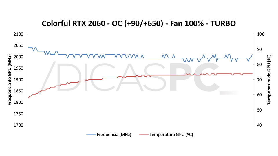Primeiramente, vamos ver como o sistema de refrigeração da Colorful se sai. Considero esse teste bastante relevante pois nas GPUs Turing, quanto menor a temperatura do GPU, maiores as chances do GPU Boost 4.0 manter a placa funcionando no ponto máximo da curva F/V. Para fazer esses testes, usei o Unigine Superposition no preset “4K Optimized”, que é um benchmark suficientemente longo (cerca de 3 minutos de duração) e que simula bem uma carga de “uso real” do GPU, em outras palavras, não é um “power virus” como o Furmark que estressa a VGA a níveis irreais e normalmente faz a placa entrar em throttling por comando do driver.