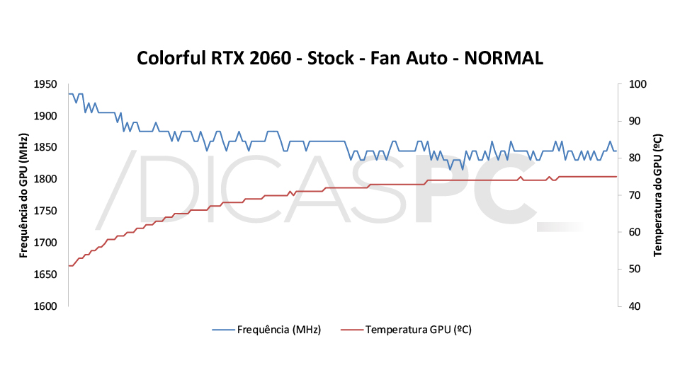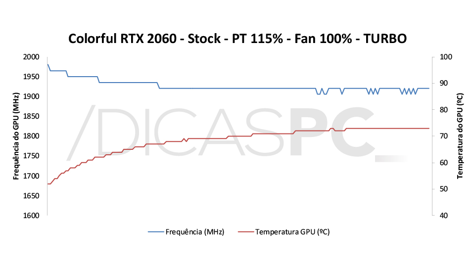 Agora em relação ao comportamento da frequência do GPU durante cada rodada, é possível ver na galeria abaixo como a Colorful RTX 2060 se saiu, lembrando que excetuando-se as termográfias acima, todos os demais testes foram realizados com a placa “lacrada”, do jeito que ela vem de fabrica.