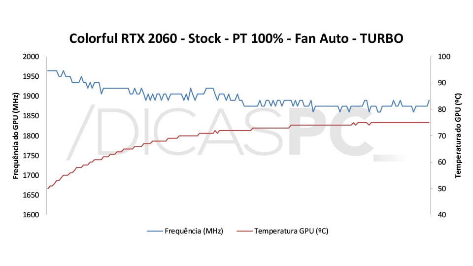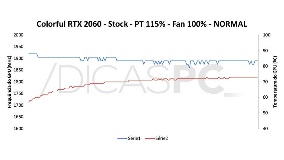 Com a bios NORMAL, conduzi apenas os testes completamente em stock ou “stock” com FAN @ 100% e PT @ 115%, enquanto que com a bios TURBO, rodei os testes em stock, “stock” com FAN @ 100% e PT @ 115%, overclock com FAN @ 100% e PT @ 115% e por fim, overclock com FAN @ 65% visando obter um resultado com um nível de ruído mais aceitável para uso diário. Não fiz testes com overclock usando a bios NORMAL por conta disso não fazer sentido, afinal de contas, nessa placa os limites para o PT são idênticos em ambas as bios, o que no final das contas resultaria em números iguais, mudando apenas o offset necessário para atingir a mesma frequência na bios “NORMAL”.
