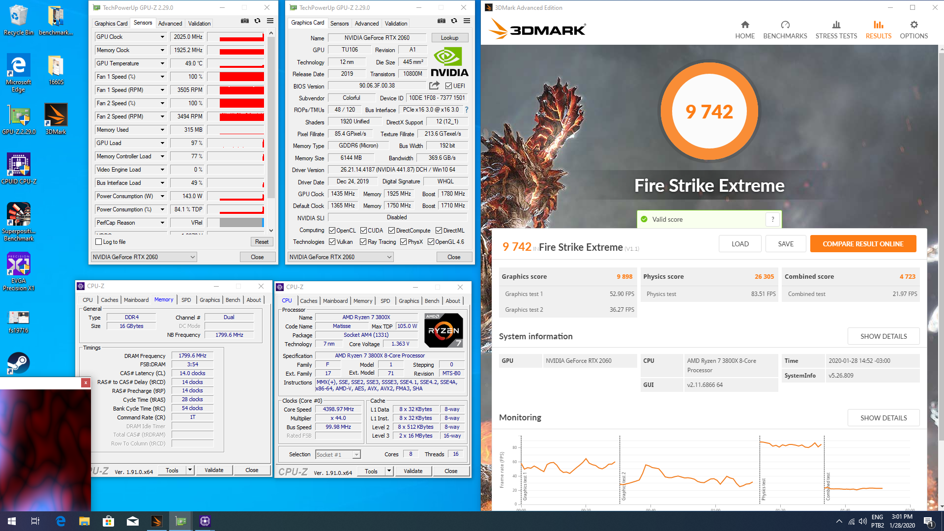 Sobre os obtidos nos benchmarks competitivos, a ideia inicial era montar o loop com o Swiftech MCW82 na Colorful RTX 2060, entretanto, assim como ocorreu na 1660 Super, a furação da placa se mostrou incompatível com o bloco e por isso fiquei limitado ao que o cooler original me permitiu fazer, de todo modo, foi possivel obter alguns resultados, que infelizmente ficaram limitados pelo Power Target e pela falta de sorte com esse exemplar, que não passou dos 2055MHz no GPU com o sistema de refrigeração original.